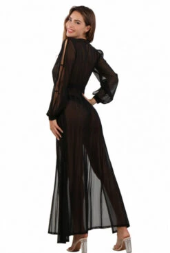 Déshabillé Long Transparent Noir Micro Résille Noué Doré