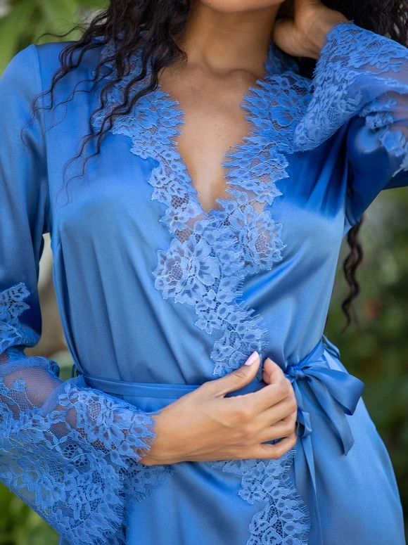 Dentelles incrustées sur le décolleté, aux bords des manches et sur le bas du déshabillé