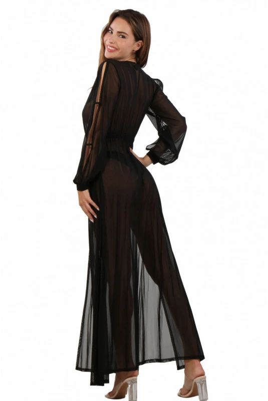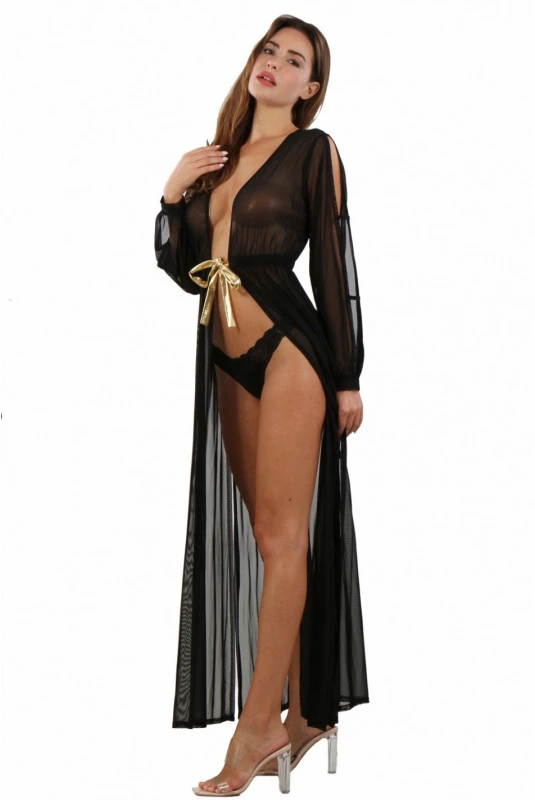 Déshabillé long Transparent Noir Micro Résille Noué Doré