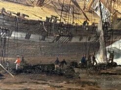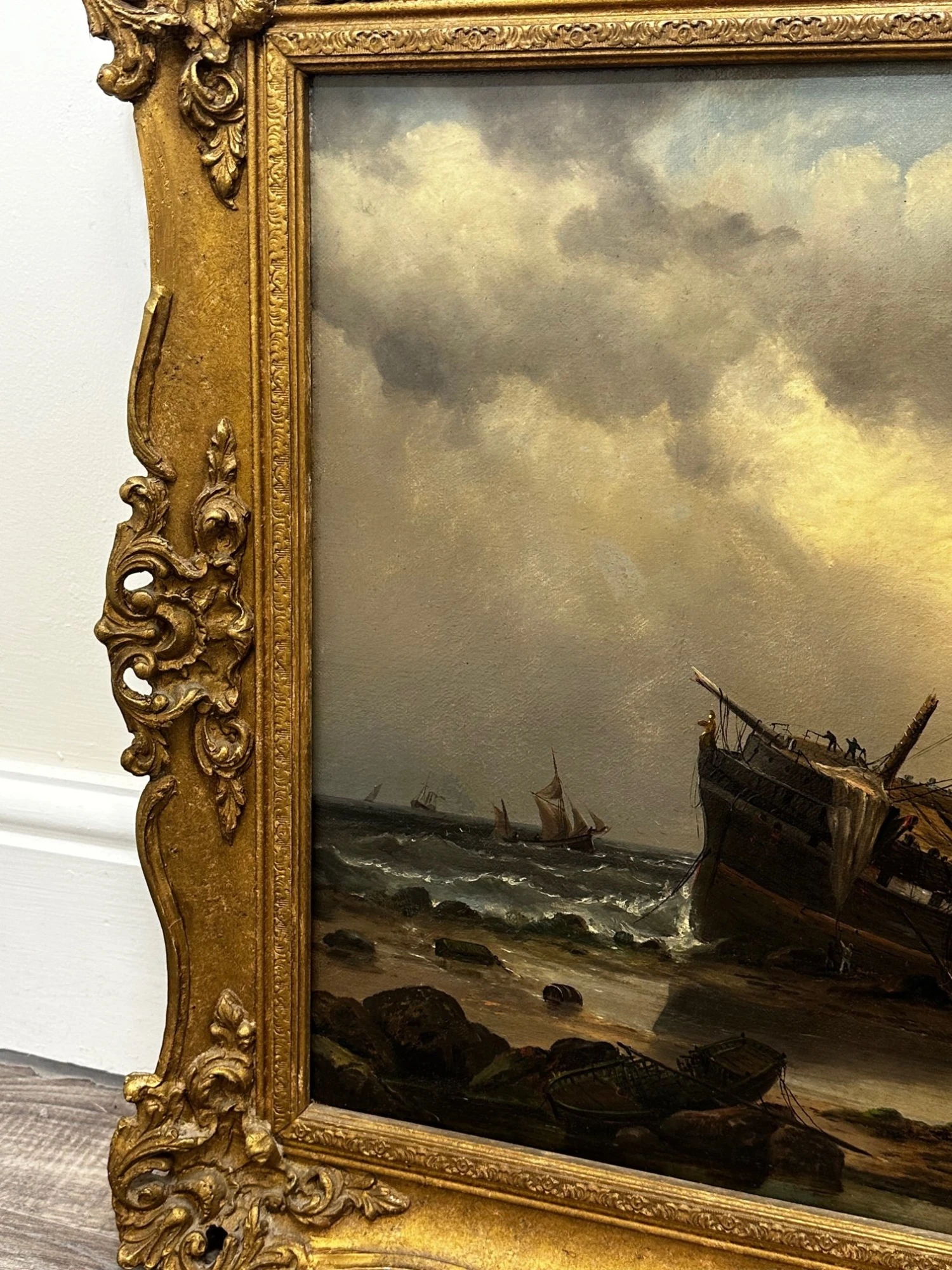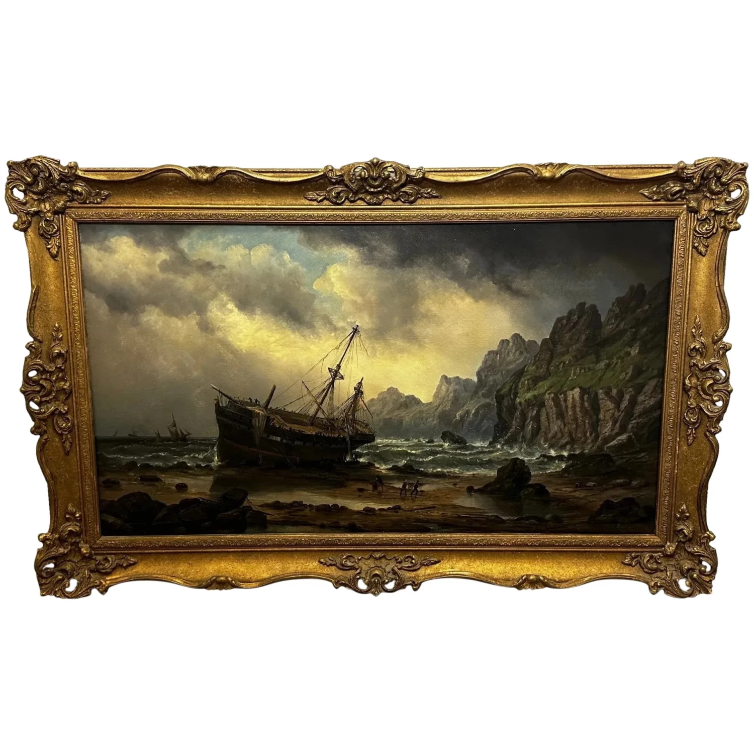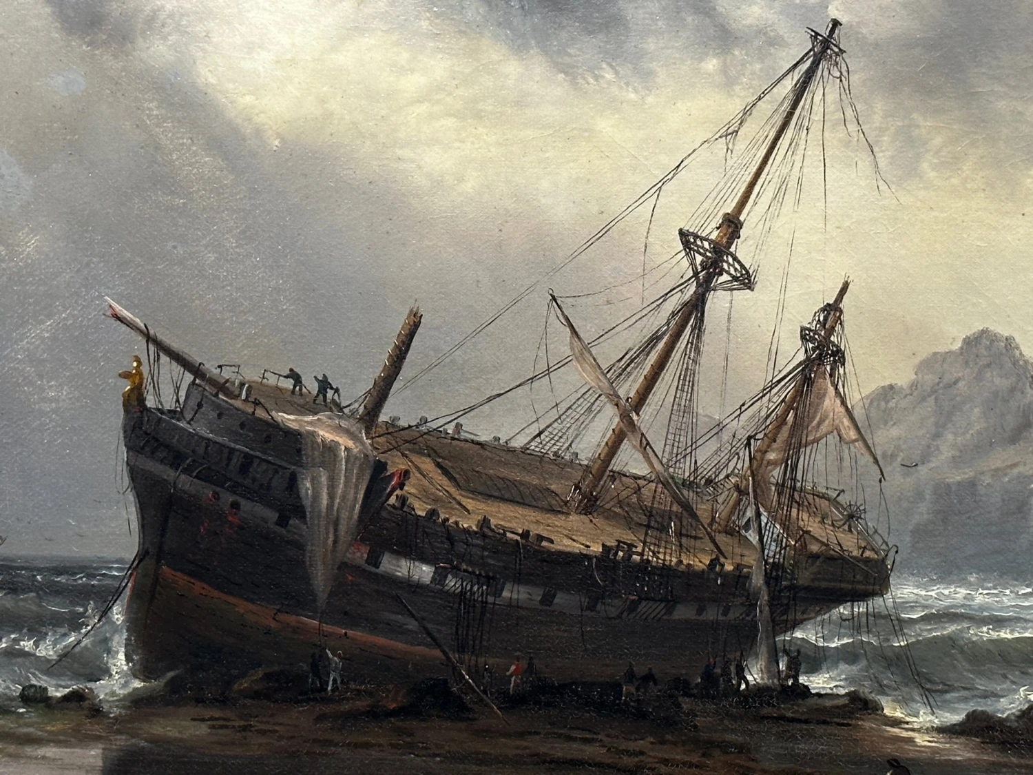 - In the lower foreground you can see various figures fisherman sailors who are walking carrying salvaging wreckage rigging from the ship, one figure has his hands around a barrel, there are also various figures on the ship and just below it who are trying to salvage the sails and other useful materials. Various ship cargo wreckage is all along the beach, to the lower left in the foreground is a longboat that is also wrecked on the rocks on the beach. Further over are 2 other ships in the background sailing along. Above with mainly heavily overcast black grey skies with a small spot of blue shining through the gloom.