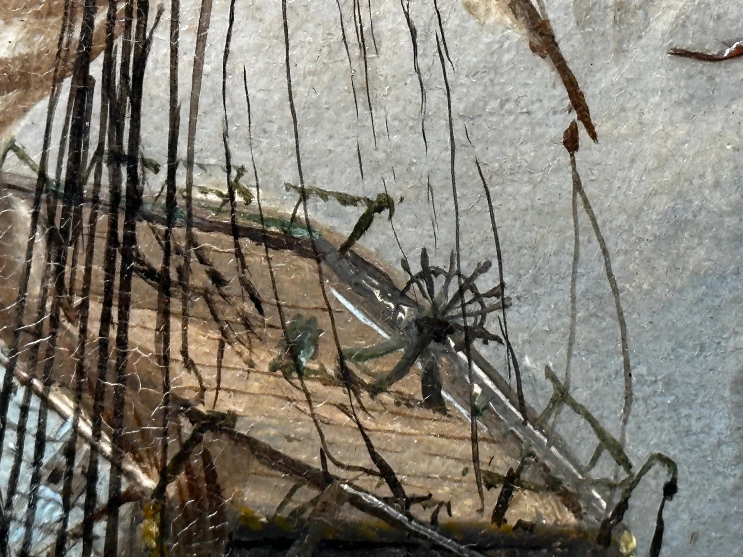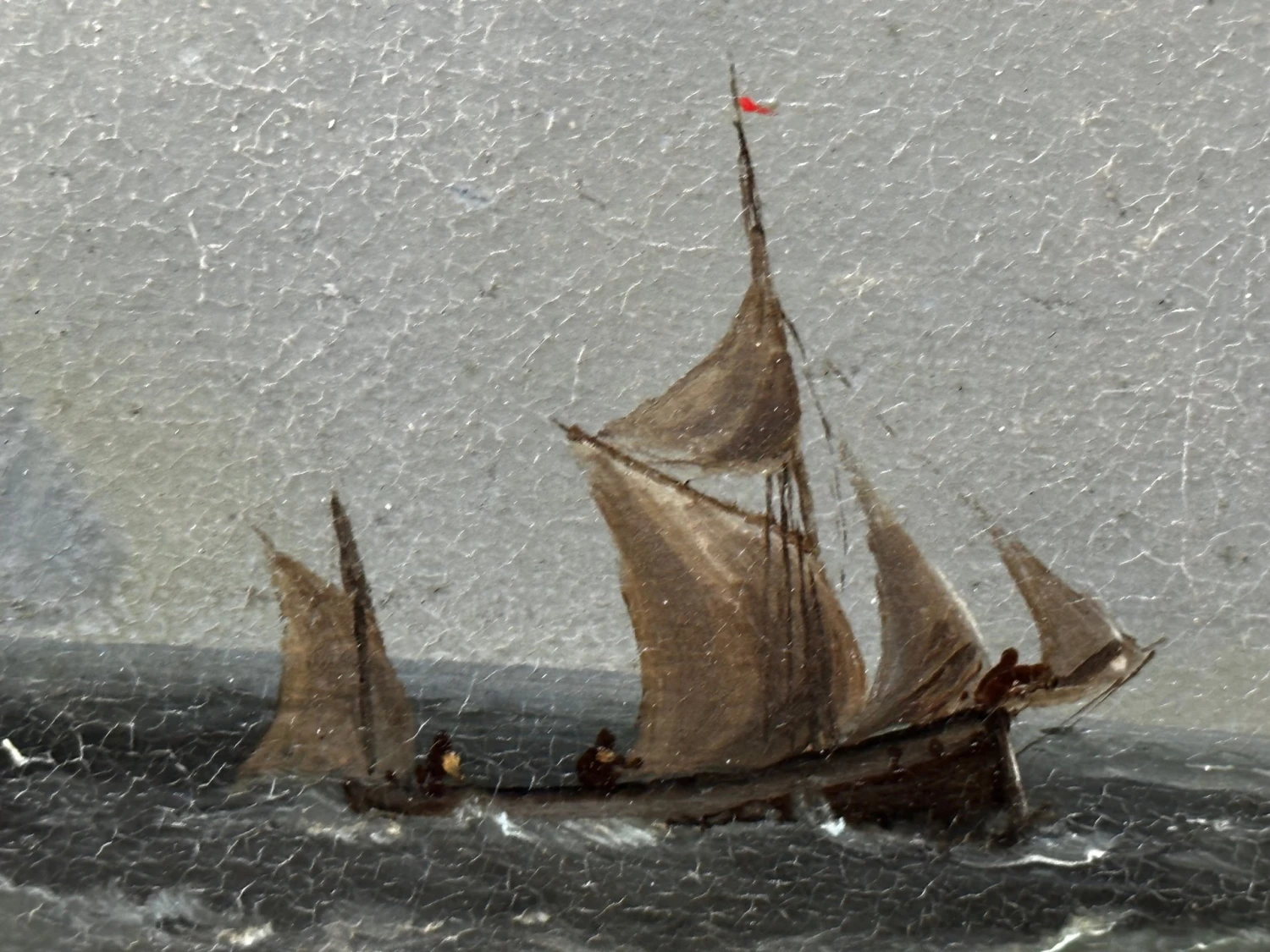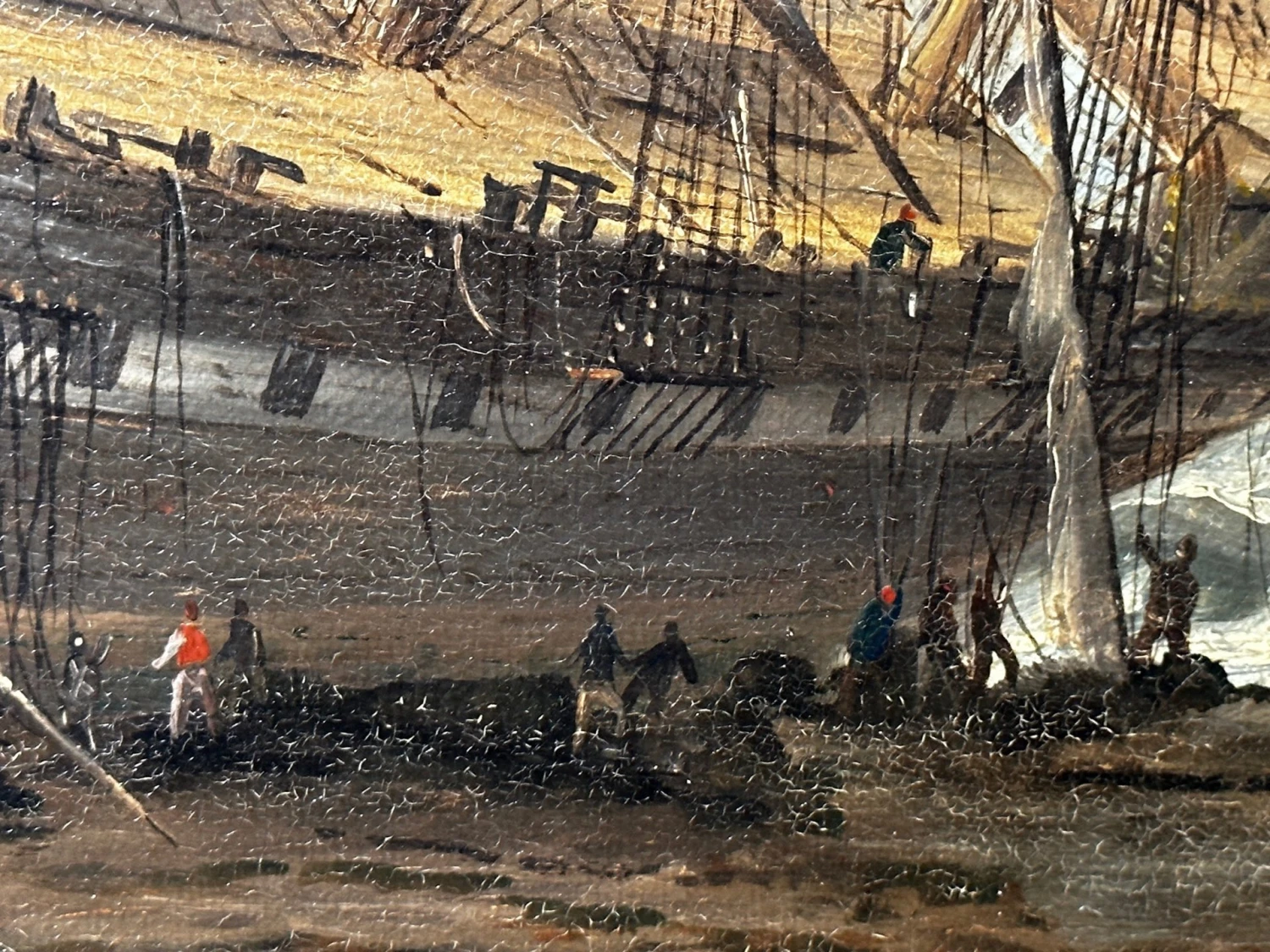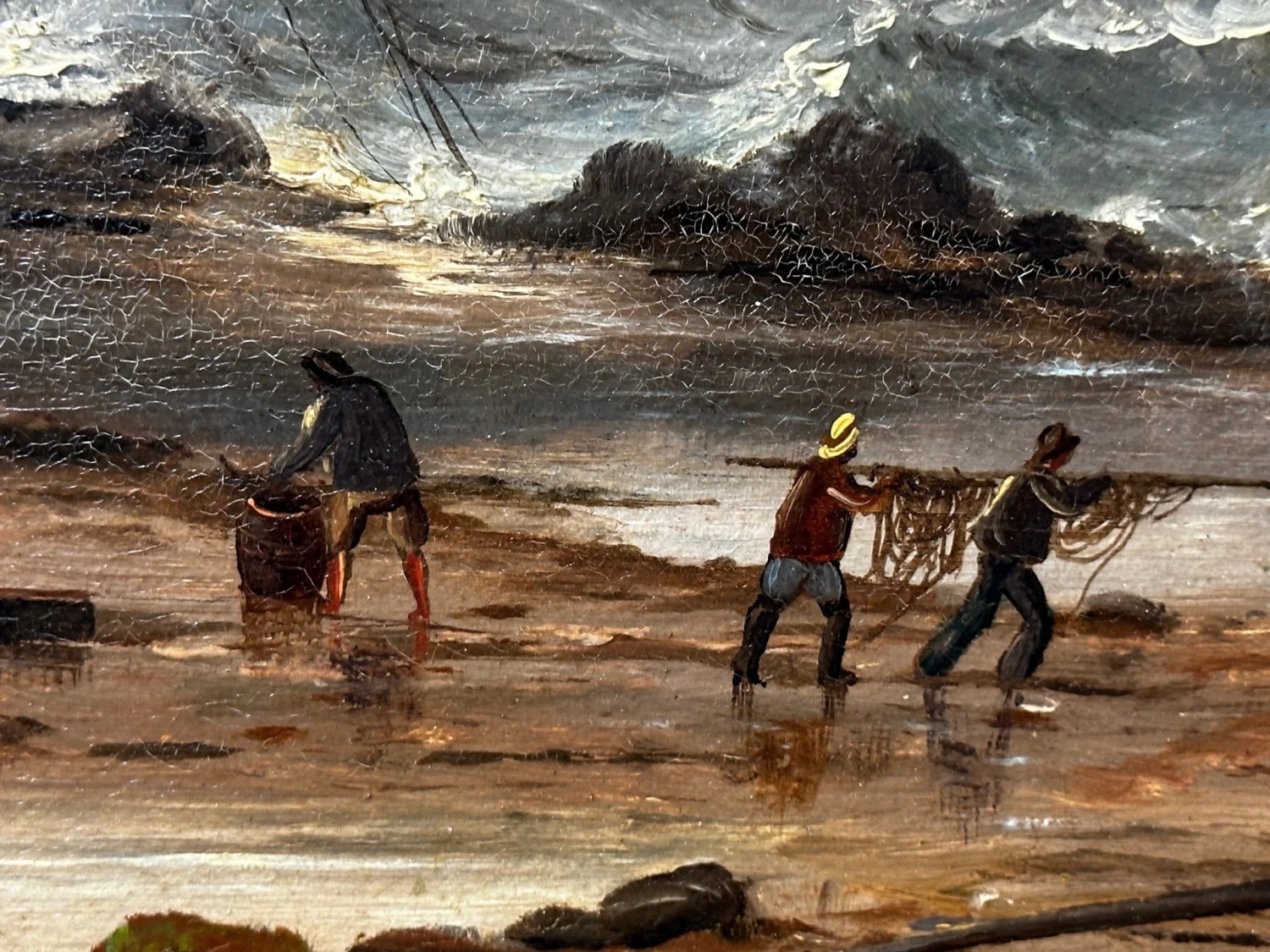 - In the lower foreground you can see various figures fisherman sailors who are walking carrying salvaging wreckage rigging from the ship, one figure has his hands around a barrel, there are also various figures on the ship and just below it who are trying to salvage the sails and other useful materials. Various ship cargo wreckage is all along the beach, to the lower left in the foreground is a longboat that is also wrecked on the rocks on the beach. Further over are 2 other ships in the background sailing along. Above with mainly heavily overcast black grey skies with a small spot of blue shining through the gloom.