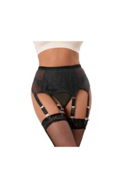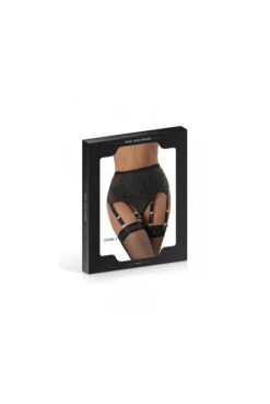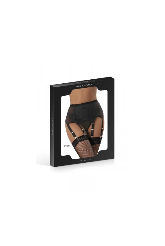 Ensemble porte-jarretelles noir semi-transparent équipé de 6 jarretelles à clip et son string assorti.