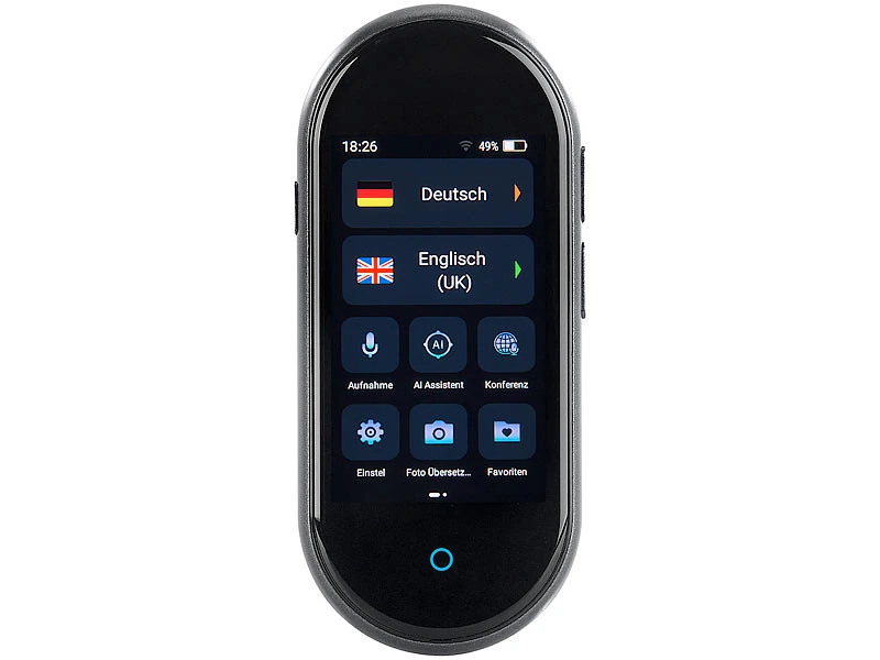 - Écran tactile 33 x 66 mm (3″) et menu intuitif : affiche les langues utilisées, le texte reconnu avec traduction, la date, l’heure et l’état de la batterie
